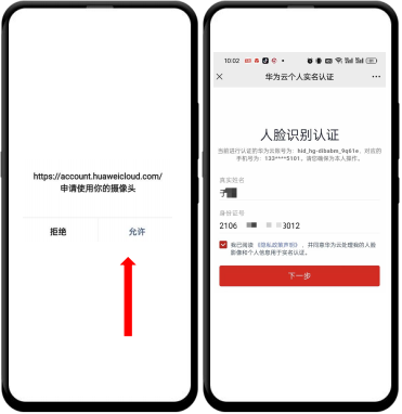 ↑①点击“允许” ②输入姓名身份证号 ③点击“开始认证”