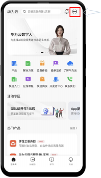 ——————————————————— 第二步、用“华为云”APP 扫这个二维码 (如果只有1个手机,不方便扫码,请看下一页) ①点击右上角扫码按键 ②扫码